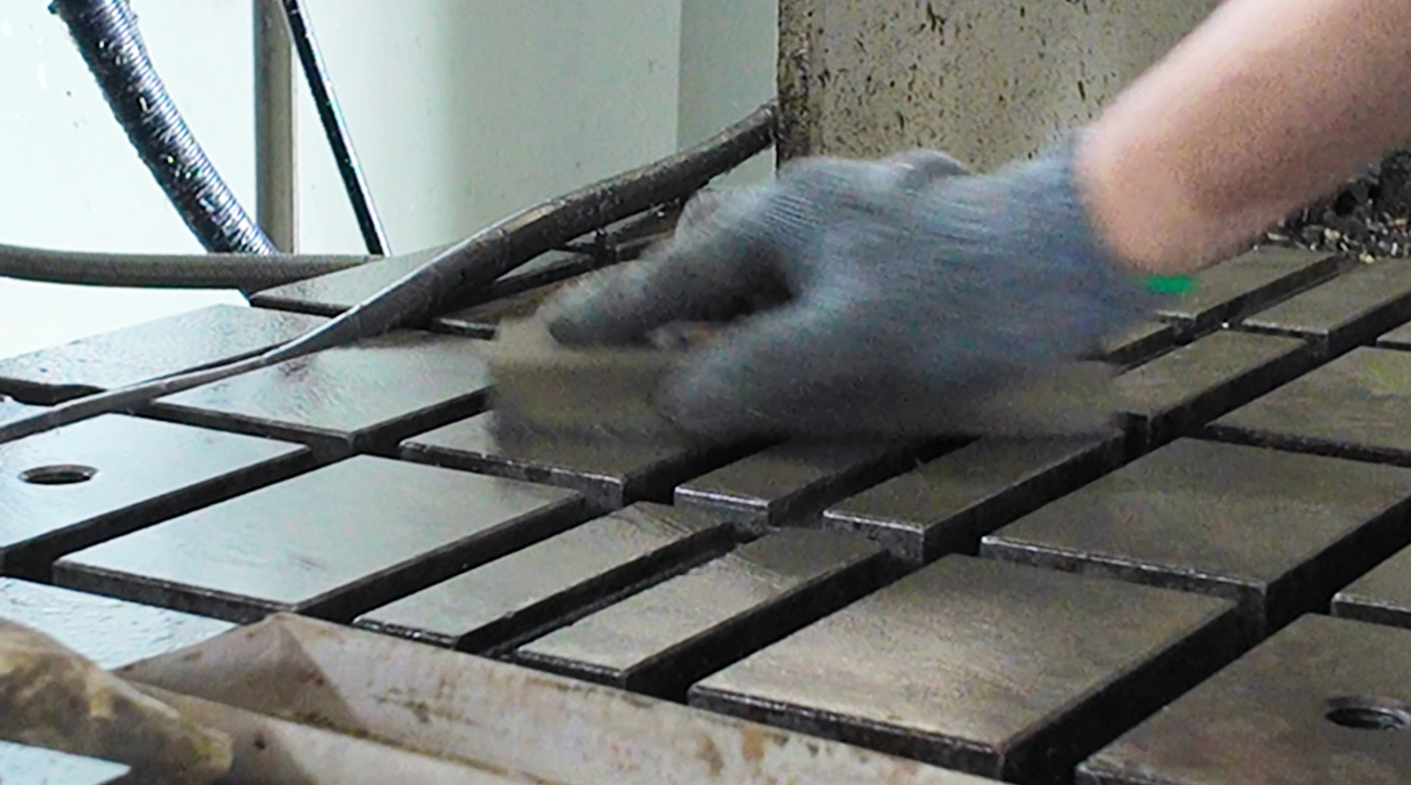 | Worktable Flatness Preparation: The Foundation of High-Precision Installation The machine's worktable serves as the fundamental reference surface for all subsequent machining. To ensure accuracy, we carefully scrape the table surface with an oil stone to remove burrs, tool marks, tiny high spots, and machining debris. A clean and perfectly flat surface is the first and most critical step in maintaining the geometric accuracy of the newly installed 4th axis. |